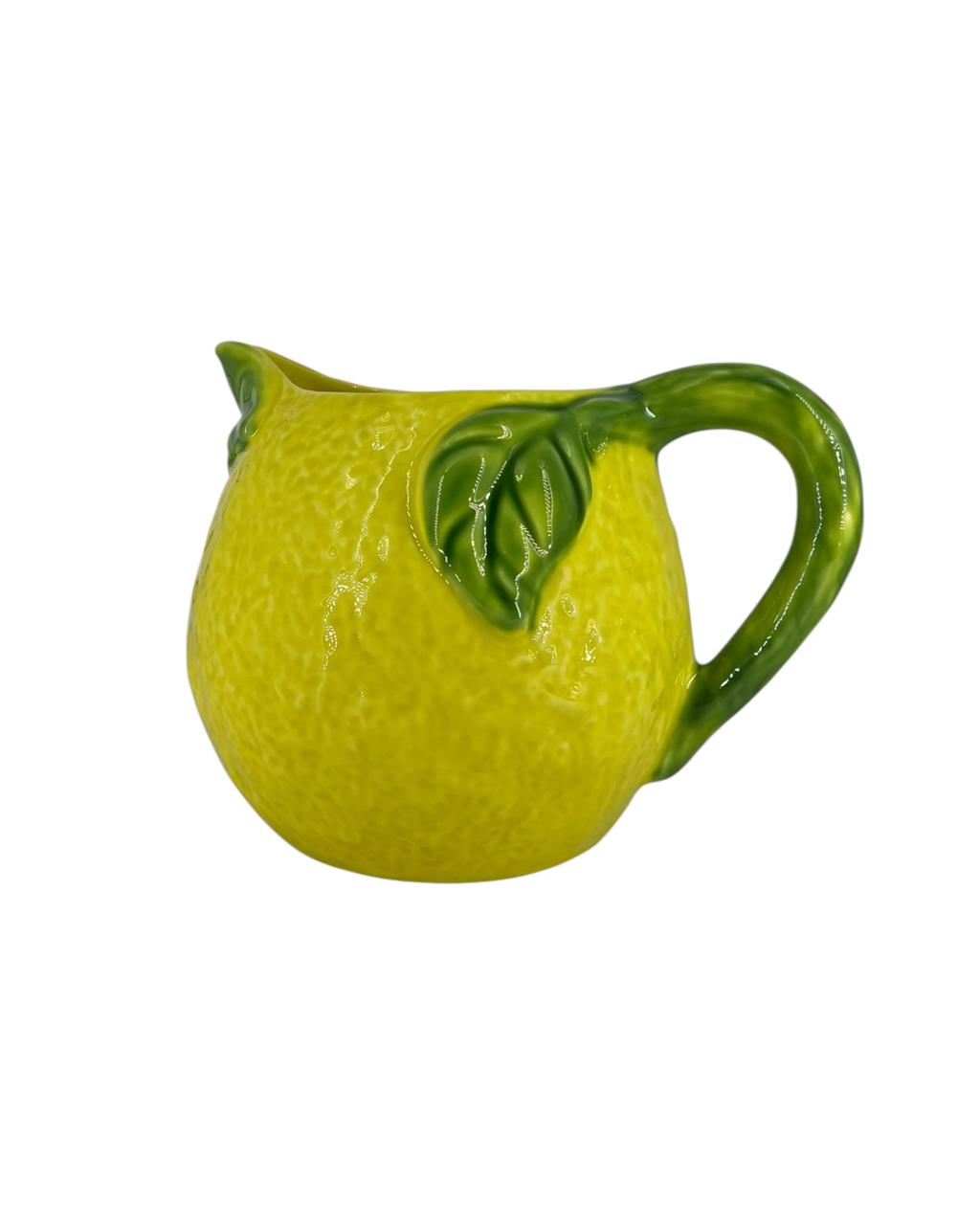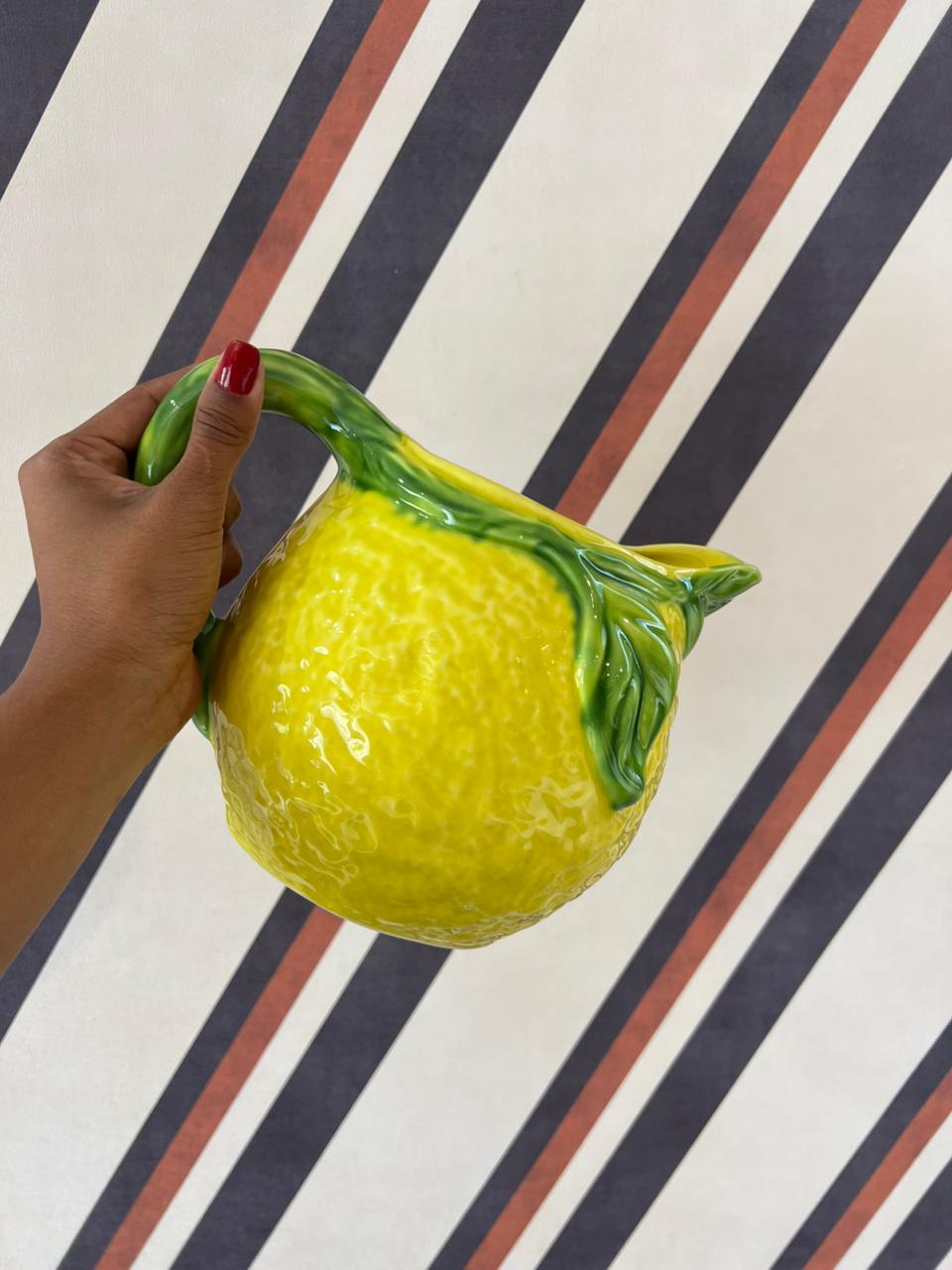 Adicione um toque de sol e frescor mediterrâneo à sua mesa posta com esta encantadora jarra de cerâmica em formato de limão. Esta peça funcional e decorativa, é perfeita para servir bebidas geladas ou como um vaso charmoso. Modelada para se assemelhar a um limão fresco, com uma superfície texturizada e esmaltada em amarelo vibrante, complementada por uma alça e folhas verdes detalhadas. Evoca a hospitalidade e o charme da Itália e de Portugal, sendo um item popular em coleções com temas de frutas.