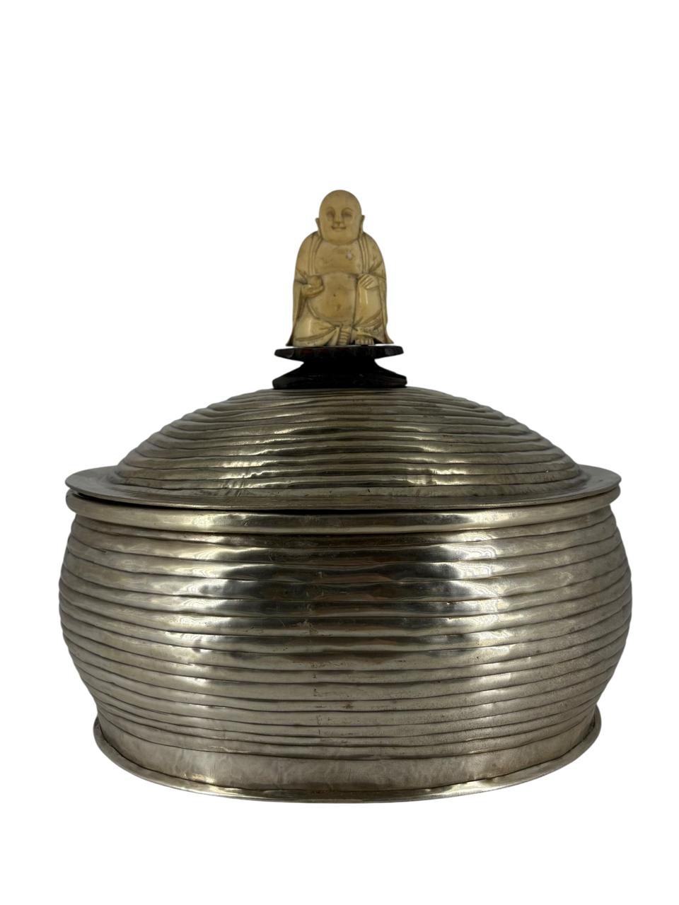 Lata em metal oval com detalhe de Buda em Marfim na tampa.