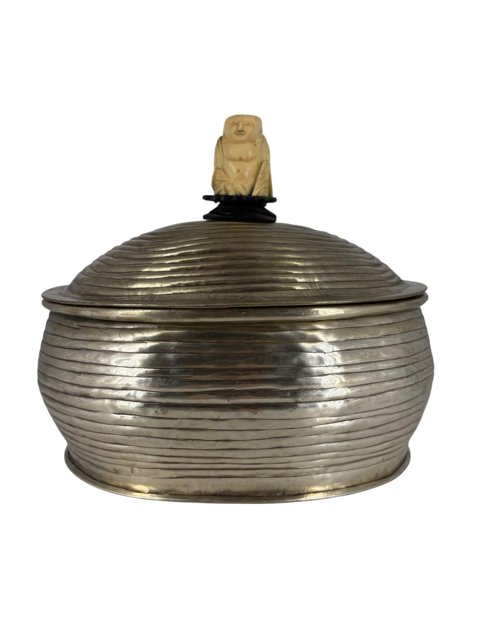 Lata em metal oval com detalhe de Buda em Marfim na tampa.