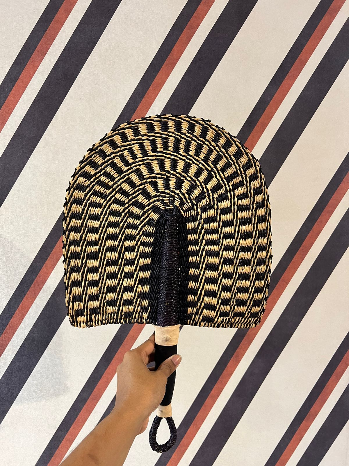 Confeccionado em palha de capim-elefante, uma fibra natural extremamente resistente e flexível, este leque não é apenas um utilitário, mas uma peça de design e expressão cultural. Tecido à mão por artesãos de Gana, cada item é único, carregando consigo gerações de tradição técnica e artística.