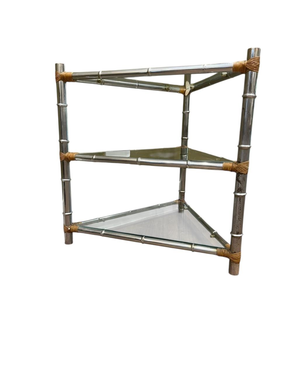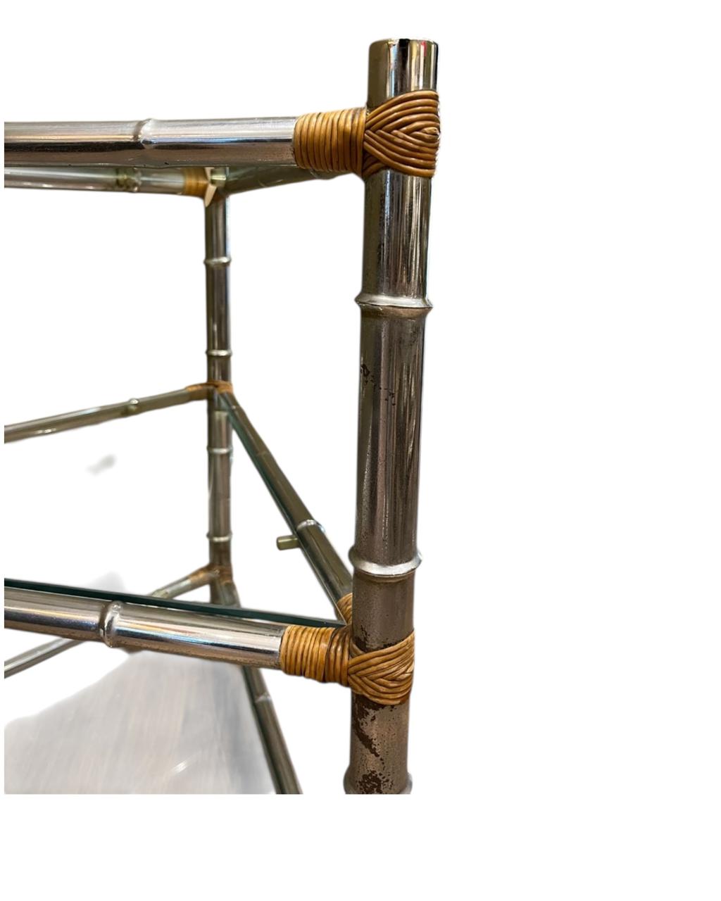 Elegante mesa lateral com estrutura em metal, inspirada em formas orgânicas, com acabamento que remete ao bambu. A peça possui três tampos em vidro, que garantem leveza visual e sofisticação ao design.