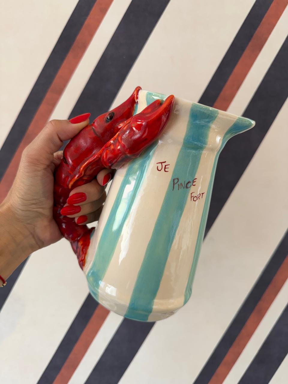 Adicione um toque de charme marítimo e humor francês à sua mesa ou ambiente com esta jarra de cerâmica artesanal. Com listras azuis e brancas em um estilo náutico clássico, o destaque irreverente fica por conta da alça escultural em formato de lagosta vermelha que parece "beliscar" a borda da jarra. A inscrição em francês, "JE PINCE FORT", que significa "Eu aperto forte" ou "Eu belisco forte", complementa a alça de lagosta com um toque divertido e exclusivo. Esta peça é perfeita para servir bebidas com estilo ou como um vaso decorativo marcante. Cada peça é moldada e pintada à mão garantindo um acabamento único e de alta qualidade.