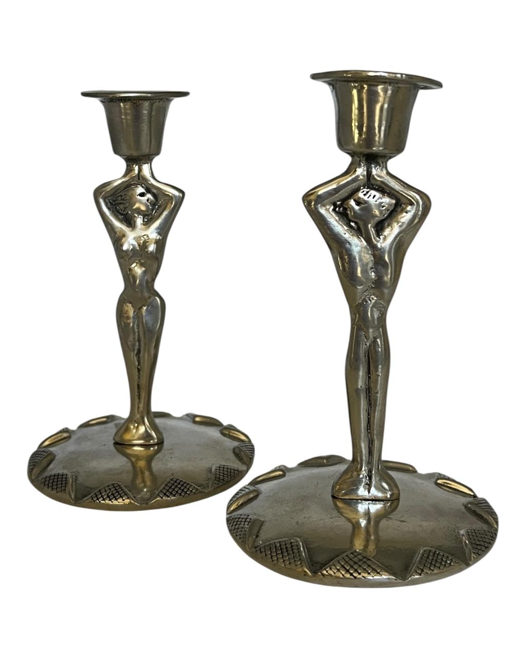 Antigo e raro par de casticais confeccionado em pewter ou pesado metal ricamente trabalhado em formato de Homem. Pecas rarissimas no Brasil. Pecas assinadas ao fundo renomada manufatura Carrol Boyes de origem Sul Africana. Peca estimada da decada de 70. Dimensoes aproximadas de: altura 13,5 cm.