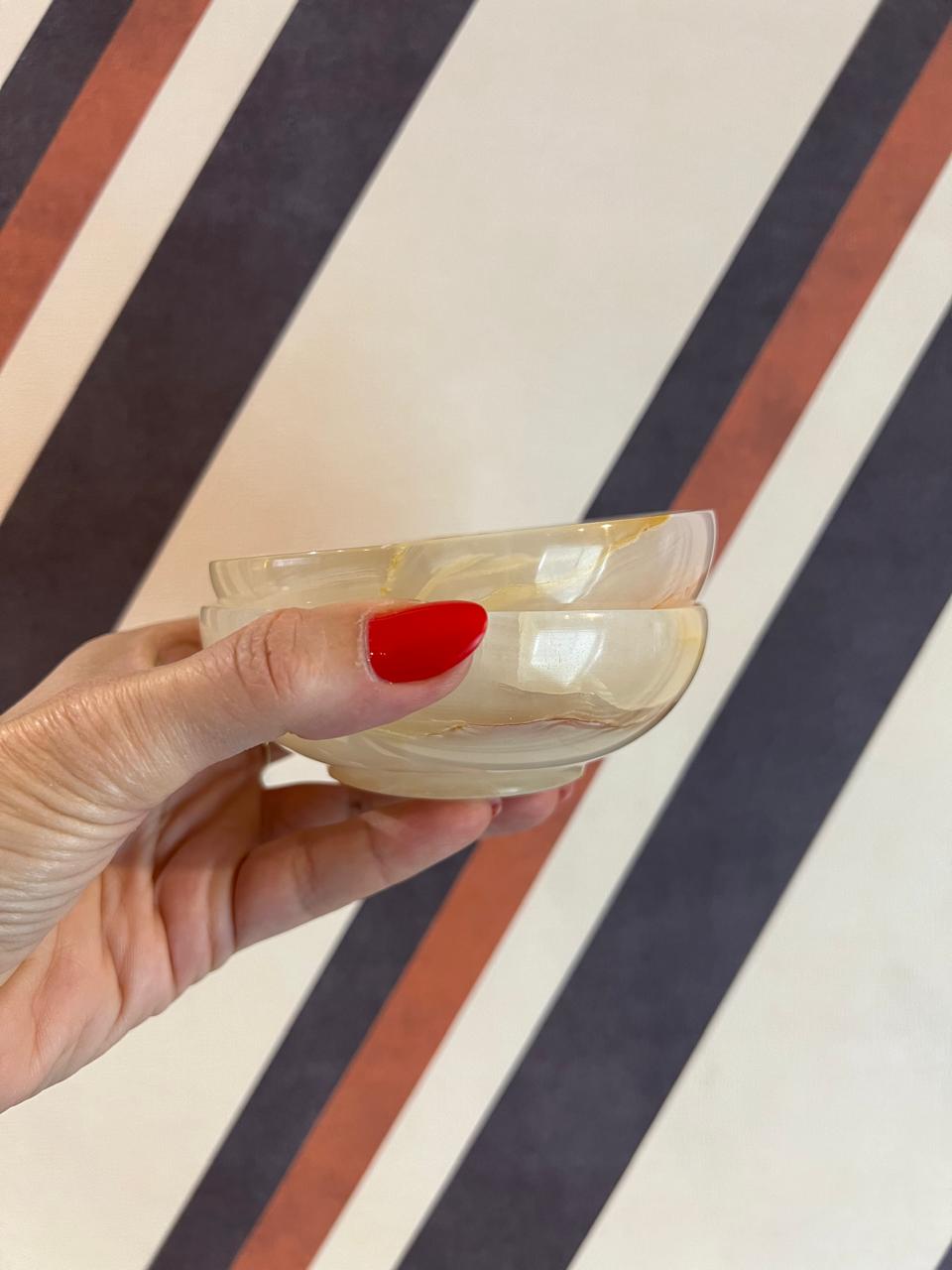 Bowl feito de alabastro, uma pedra natural conhecida por seus padrões únicos e, neste caso, por sua translucidez que permite a passagem de luz, realçando os veios e as nuances de cor da pedra. Apresenta um formato de bowl simples e orgânico, com bordas arredondadas e uma superfície lisa e polida, destacando a beleza natural do material. Ideal para decoração de ambientes, como peça central em mesas, ou para servir alimentos secos e condimentos, adicionando um toque de elegância e sofisticação.
