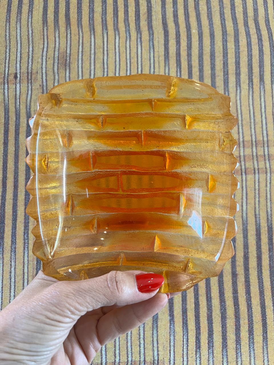 Petisqueira na cor âmbar rica e textura em relevo que evoca a estética da época, esta peça é uma representação autêntica do design dos anos 60/70. Ideal para usar como uma elegante bandeja para joias, chaves, petiscos, ou simplesmente como um objeto de arte em sua mesa de centro ou estante.