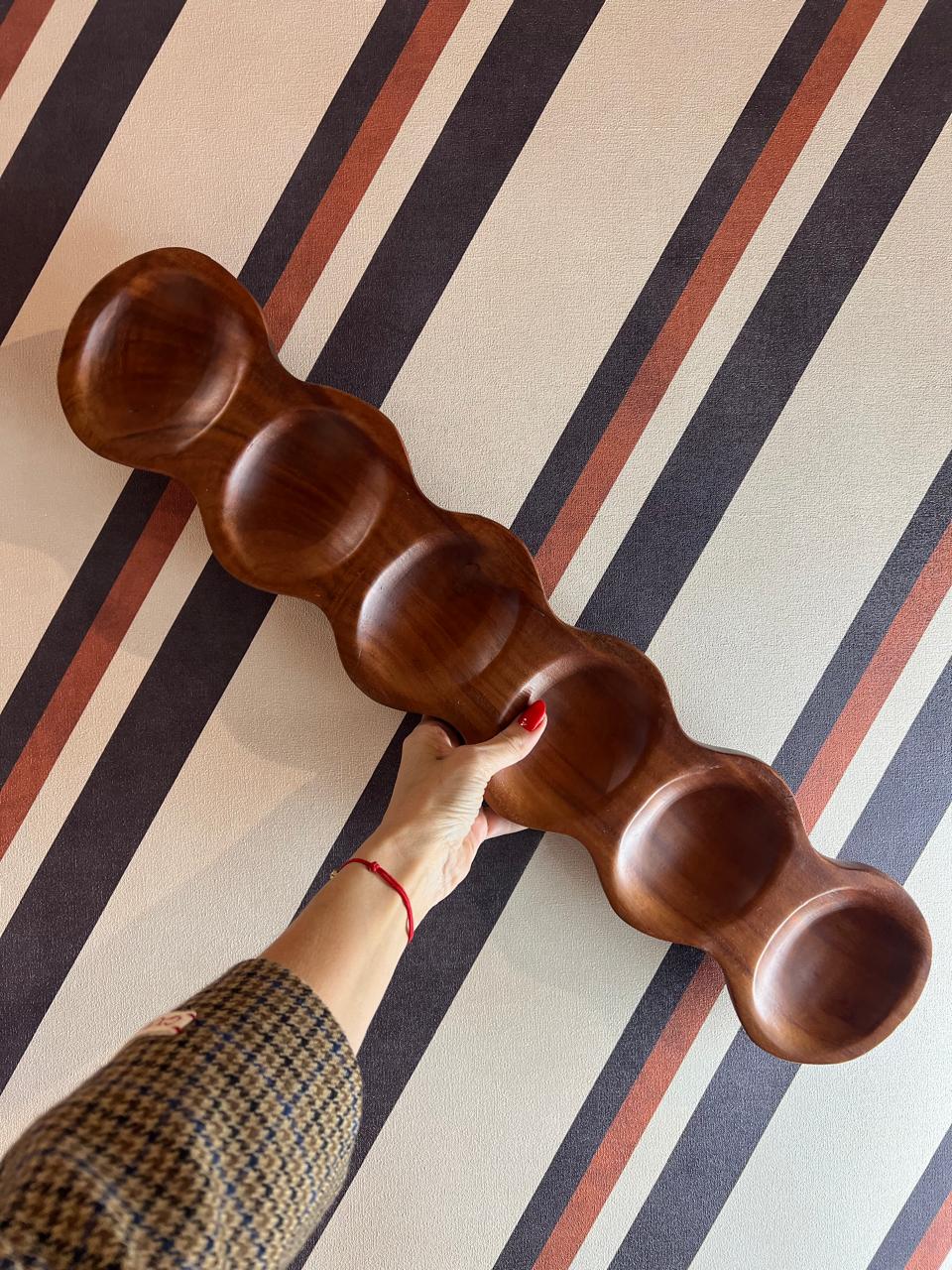 Esta petisqueira de madeira maciça com 6 divisórias é a peça perfeita para adicionar um toque de elegância e funcionalidade à sua mesa. Com um design alongado e orgânico, ela é ideal para servir uma variedade de petiscos, como queijos, frios, frutas secas, molhos e castanhas. Eleve a experiência de servir com esta peça charmosa, que combina beleza natural e praticidade.