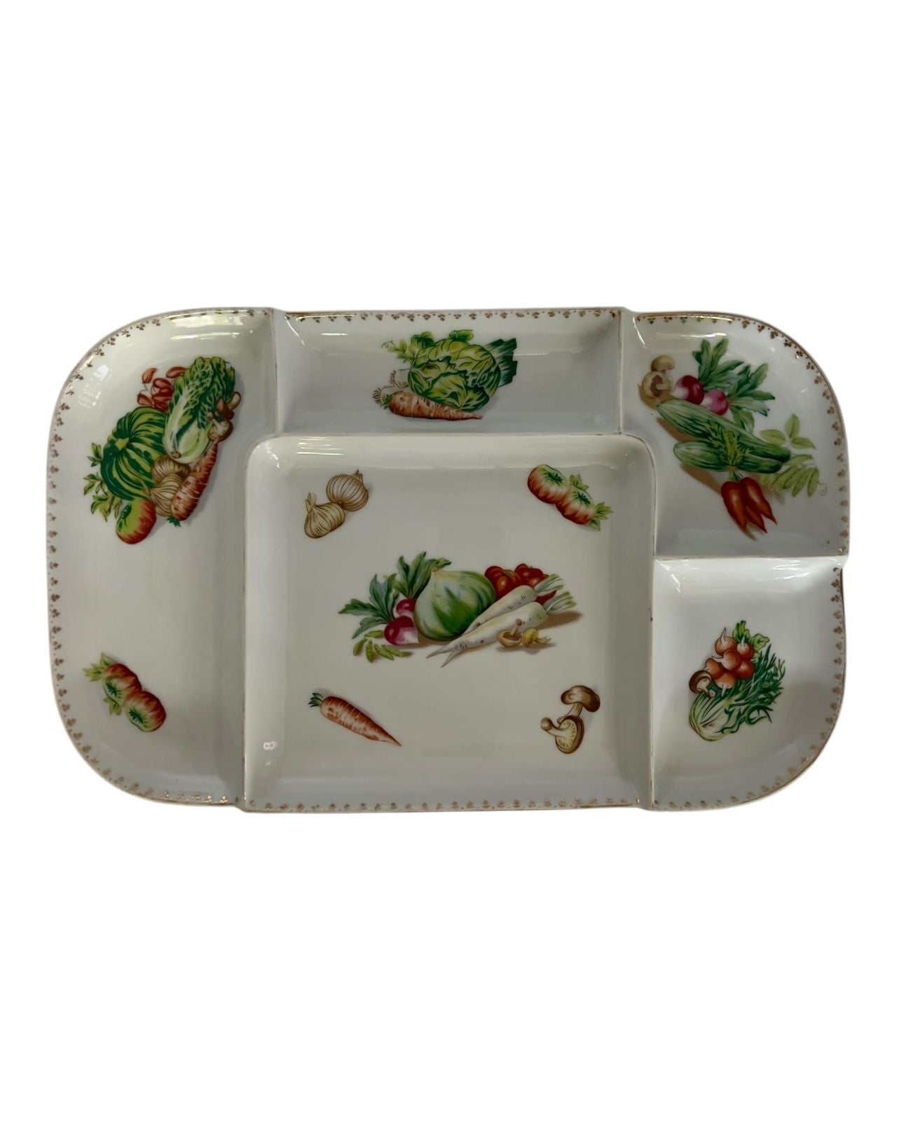 ANTIGA E PITORESCA PETISQUEIRA EM PORCELANA, COM 5 DIVISÓRIAS, DECORADO COM IMAGENS DE LEGUMES. ORIGEM BRASIL. MARCA REAL.