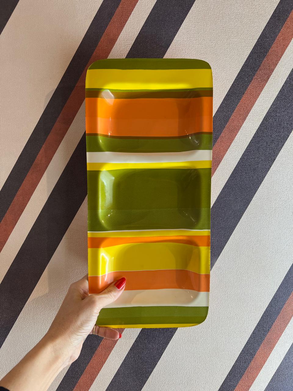 Petisqueira ideal para servir diferentes tipos de petiscos, molhos, aperitivos ou acompanhamentos, mantendo-os separados uns dos outros. O design com divisórias oferece praticidade e elegância à apresentação. O padrão de listras horizontais e o esquema de cores (tons de verde-oliva, amarelo mostarda, laranja queimado, branco e marrom) são representativos do estilo vintage das décadas de 1960 e 1970.