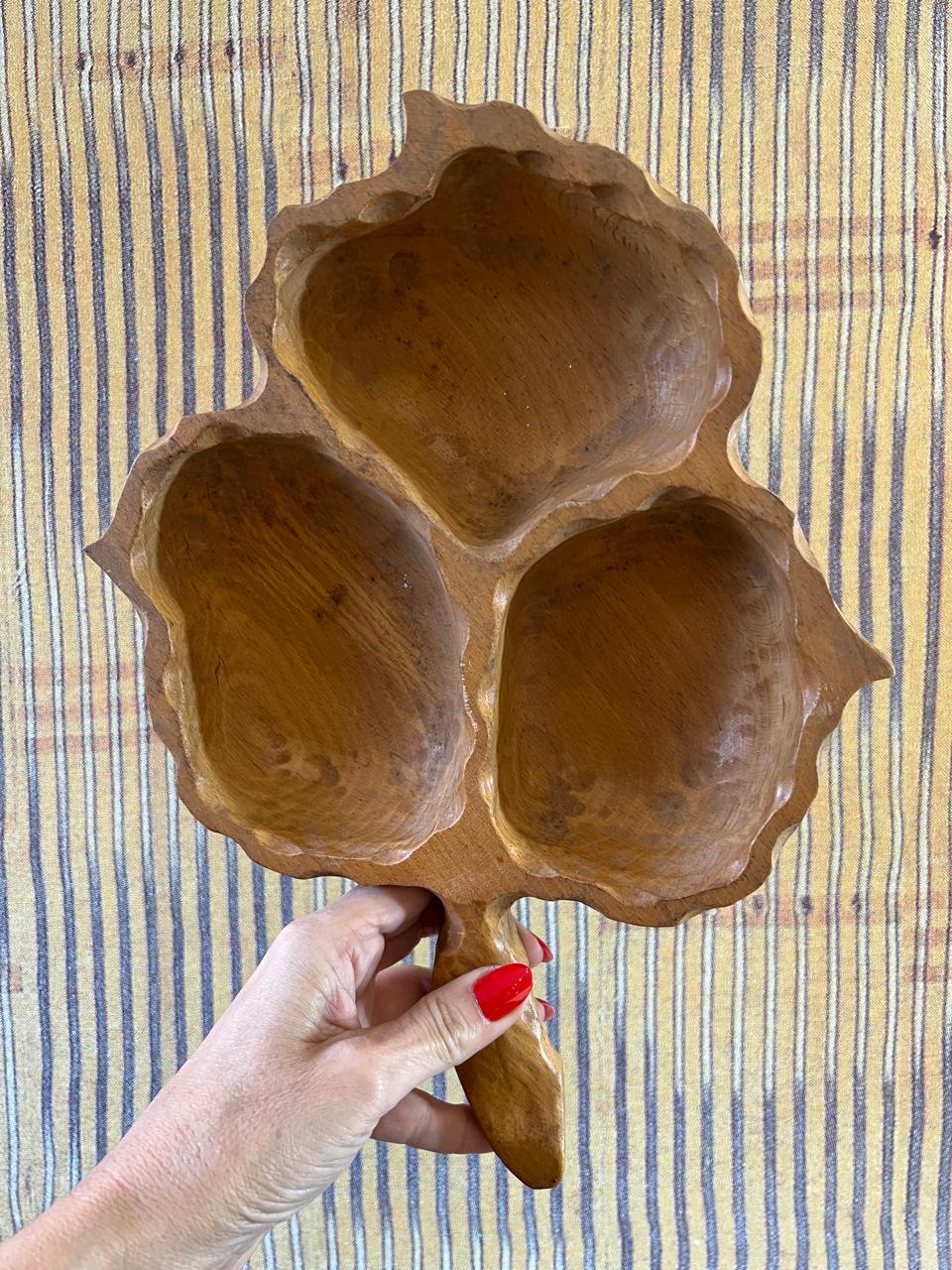 A peça na imagem tem um formato de uma folha com três compartimentos, pode ser utilizada em diversas ocasiões para servir aperitivos, saladas, frutas, nozes ou como um objeto decorativo para adornar mesas e aparadores. O entalhe e o material conferem um estilo rústico e natural à peça, adicionando um toque de elegância e originalidade à decoração da casa ou da mesa.