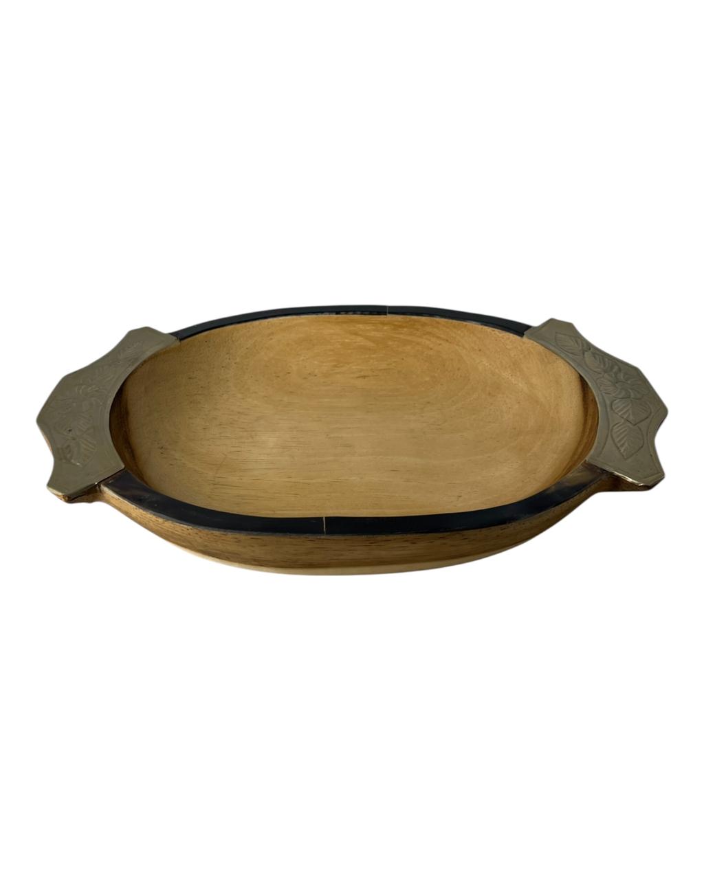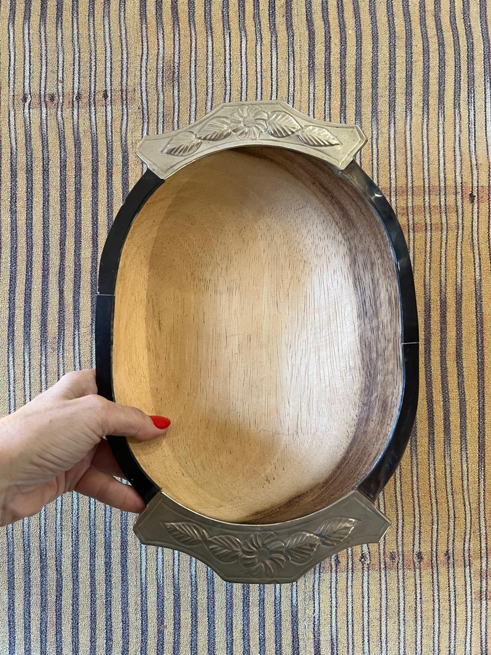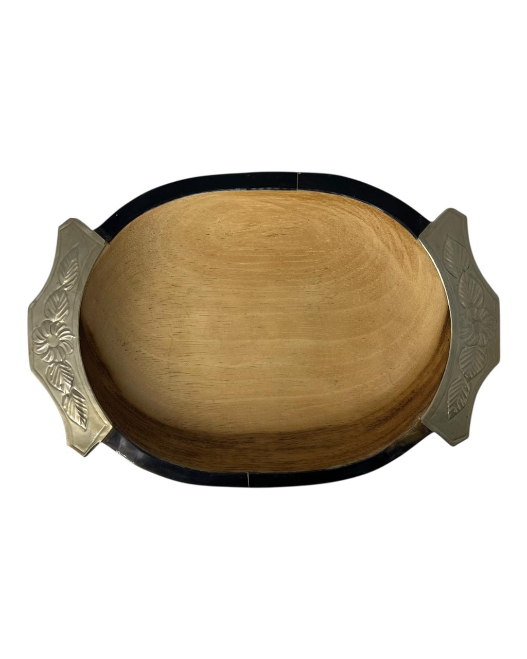 Petisqueira feita de madeira, com as alças laterais de alpaca, uma liga metálica que se assemelha à prata. As alças de alpaca apresentam um design ornamentado, adicionando um toque decorativo à peça. Este tipo de petisqueira pode ser usado para servir alimentos, como frutas ou pães, ou como item decorativo em ambientes como salas e cozinhas.
