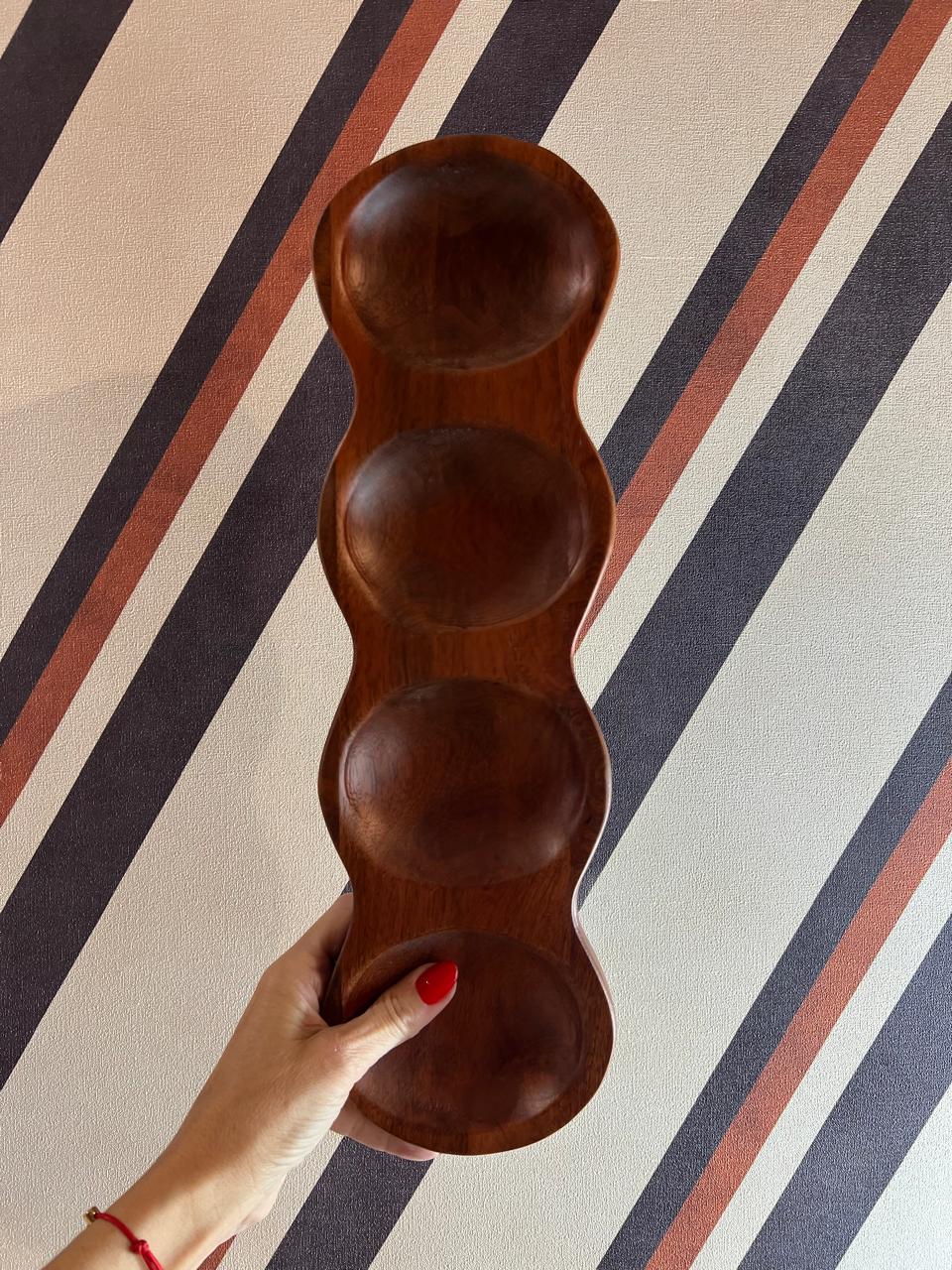 Esta petisqueira de madeira maciça com 4 divisórias é a peça perfeita para adicionar um toque de elegância e funcionalidade à sua mesa. Com um design alongado e orgânico, ela é ideal para servir uma variedade de petiscos, como queijos, frios, frutas secas, molhos e castanhas. Eleve a experiência de servir com esta peça charmosa, que combina beleza natural e praticidade.
