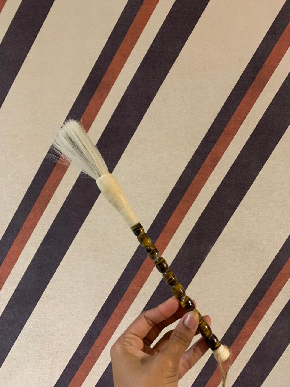 Valorizado no design de interiores por misturarem a rusticidade orgânica das pedras com a delicadeza artesanal. Eles servem como um ponto de conexão entre o design moderno e a história milenar asiática. O seu exemplar possui um cabo formado por contas de pedras. As partes brancas são tradicionalmente feitas de osso esculpido. Este material é escolhido por sua durabilidade e pela capacidade de ser polido até atingir um brilho suave que imita o marfim. Na tradição chinesa, o pincel simboliza sabedoria, criatividade e fluidez. Ter um pincel decorativo em casa é considerado um amuleto para atrair boas energias e sucesso intelectual.