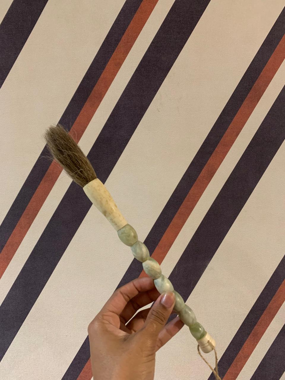 Valorizado no design de interiores por misturarem a rusticidade orgânica das pedras com a delicadeza artesanal. Eles servem como um ponto de conexão entre o design moderno e a história milenar asiática. O seu exemplar possui um cabo formado por contas de pedras. As partes brancas são tradicionalmente feitas de osso esculpido. Este material é escolhido por sua durabilidade e pela capacidade de ser polido até atingir um brilho suave que imita o marfim. Na tradição chinesa, o pincel simboliza sabedoria, criatividade e fluidez. Ter um pincel decorativo em casa é considerado um amuleto para atrair boas energias e sucesso intelectual.
