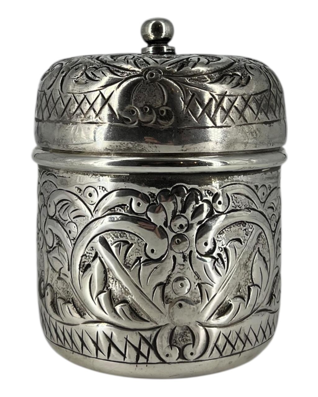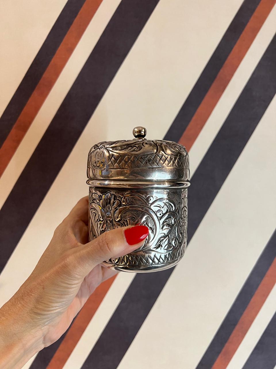 Potiche em Alpaca com acabamento artesanal em relevo. Ideal para usar como peça decorativa ou para guardar pequenos itens, se destacando pelo seu brilho e trabalho artístico em seus detalhes.