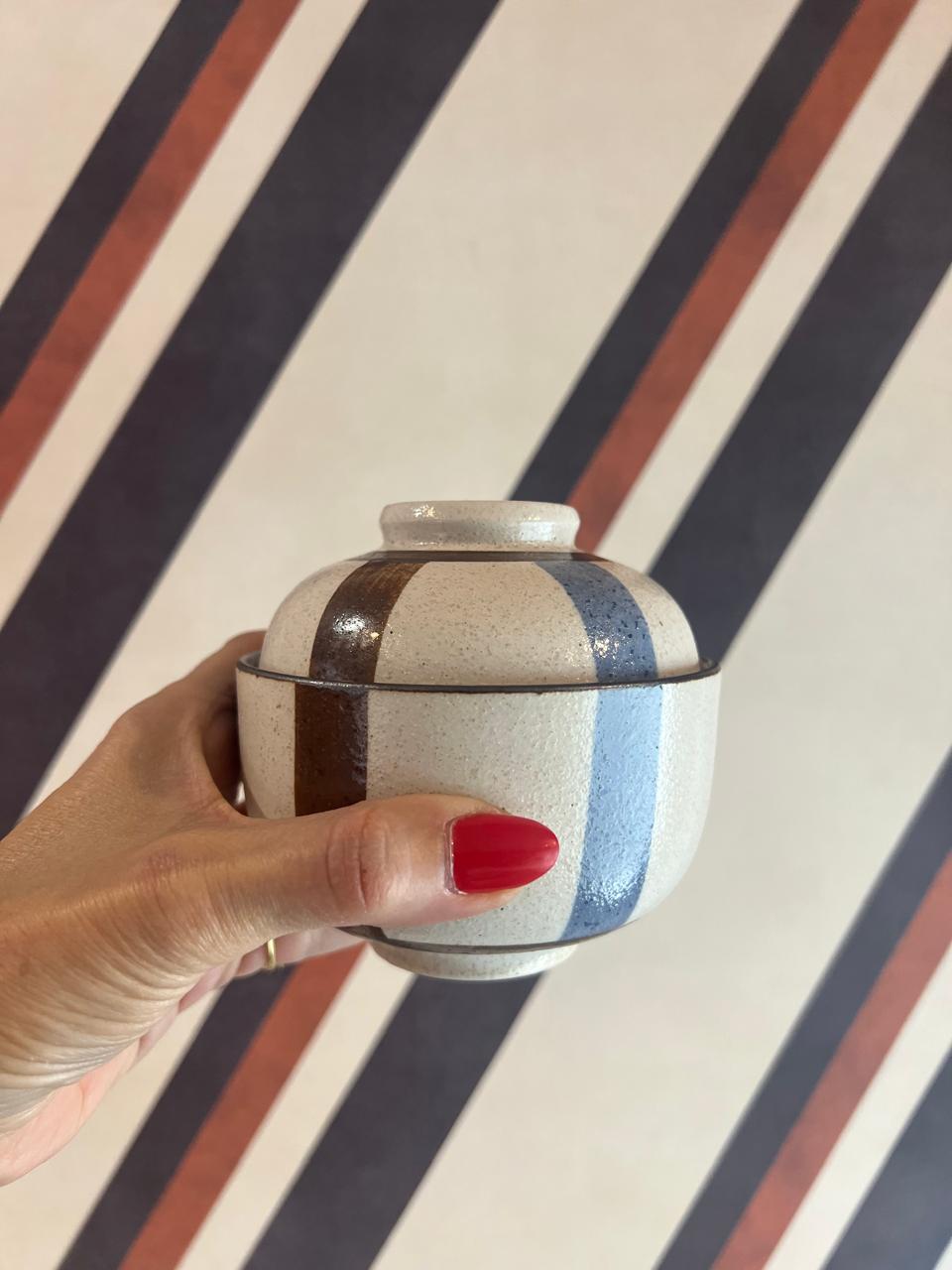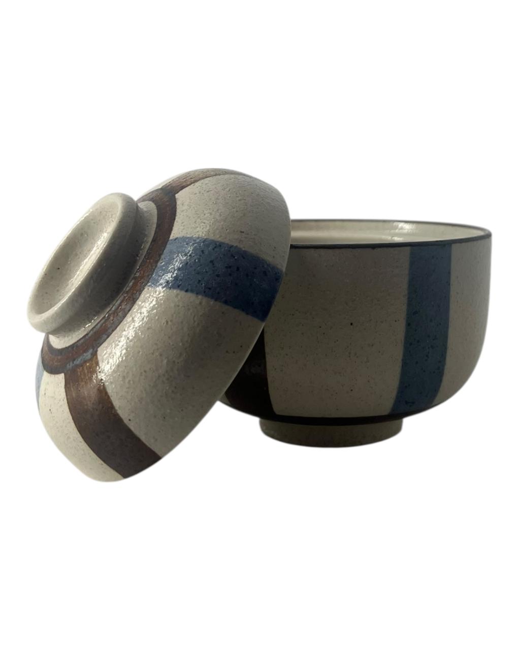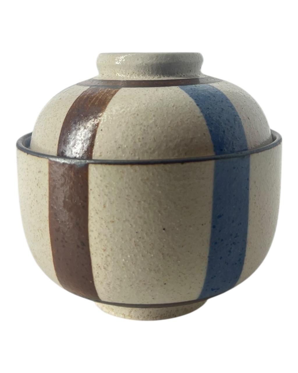 Esta charmoso potiche de cerâmica com tampa, de inspiração japonesa, é a peça perfeita para adicionar um toque artesanal à sua mesa. Com um design elegante de listras em tons terrosos de marrom e vibrantes azuis, a tigela exibe um acabamento rústico e texturizado que realça seu caráter único.