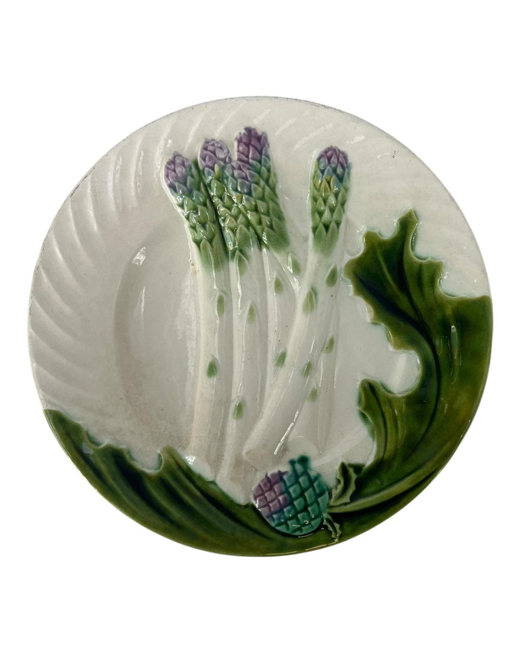 A peça é caracterizada por seu design em relevo, com aspargos e uma alcachofra claramente esculpidos e pintados no centro da travessa. A majólica de Salins frequentemente apresentava temas de vegetais, como aspargos e alcachofras, em suas travessas e pratos. O estilo é Majólica, que é um tipo de cerâmica esmaltada com uma superfície ricamente colorida e vidrada, conhecida por seus detalhes em relevo.
