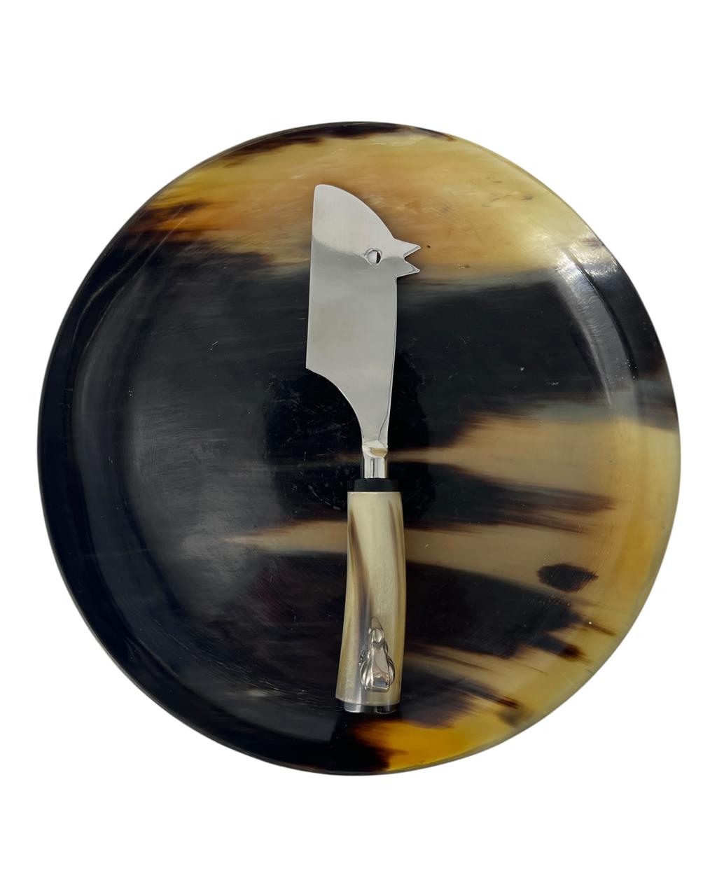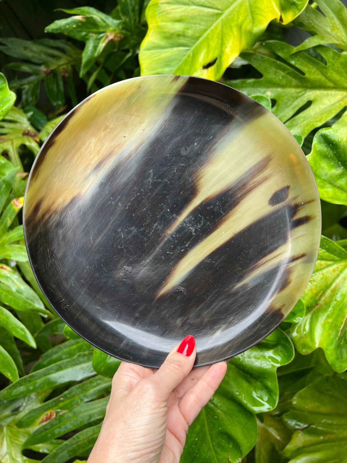 Prato artesanal feito em chifre, comum na era medieval e é feito a partir de chifre de animal, como o de gado. É caracterizado pelas variações naturais de cor e padrão do material, que podem incluir tons de preto, marrom e creme.