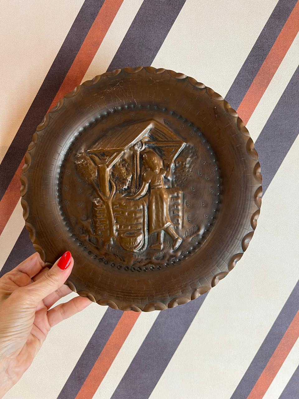 Prato decorativo em cobre com alto-relevo. A peça é feita de cobre, um material durável e que permite a criação de detalhes intrincados em relevo. O desenho retrata uma cena rural, com uma figura feminina ao lado de um poço, o que era um tema comum em peças decorativas da época. Este tipo de objeto é frequentemente usado como item de decoração de parede, trazendo um toque de arte e história aos ambientes.