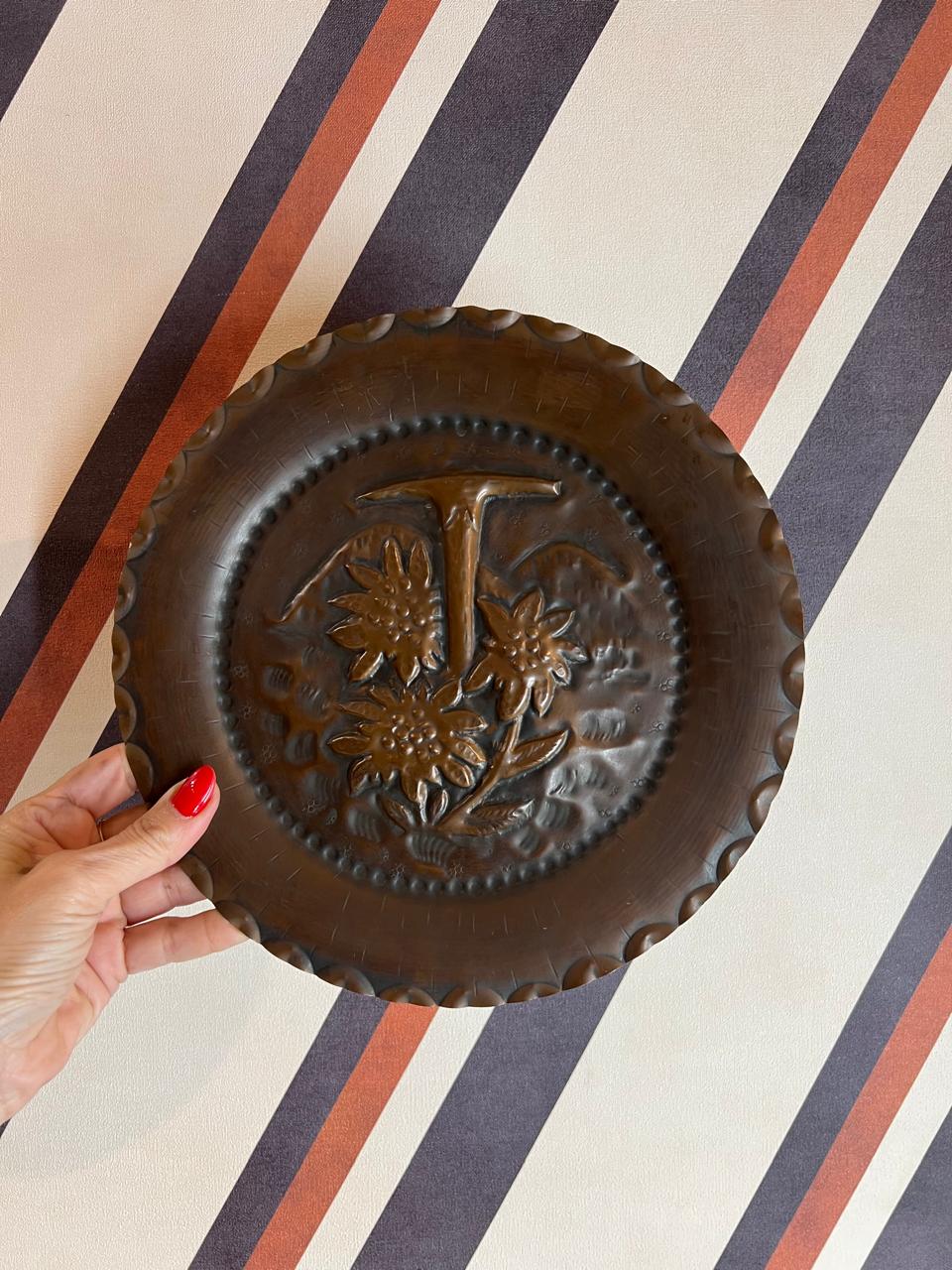 Prato decorativo em cobre com alto-relevo. A peça é feita de cobre, um material durável e que permite a criação de detalhes intrincados em relevo.