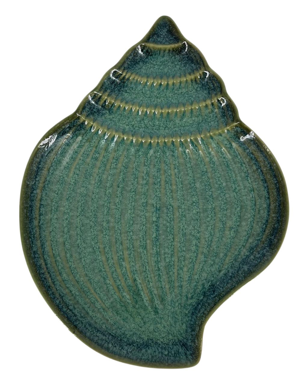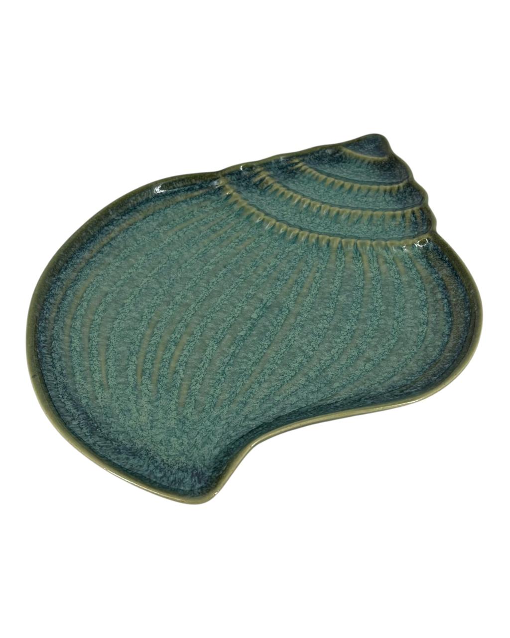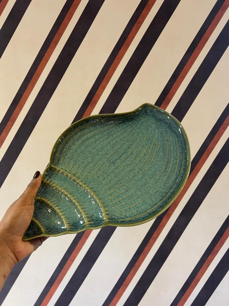 Adicione um toque de sofisticação e natureza à sua mesa com esta deslumbrante travessa de cerâmica. Seu formato orgânico de concha e o acabamento esmaltado em um rico tom de verde teal a tornam uma peça única e convidativa. Inspirada nas formas suaves da natureza, esta travessa apresenta sulcos texturizados que adicionam profundidade e um apelo rústico e artesanal.