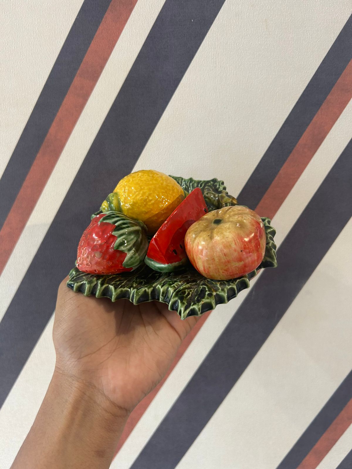 Antigo aplique de parede "frutas sobre folha" em faiança Portuguesa marcado no fundo "Álvaro José - Caldas da Rainha - Portugal".