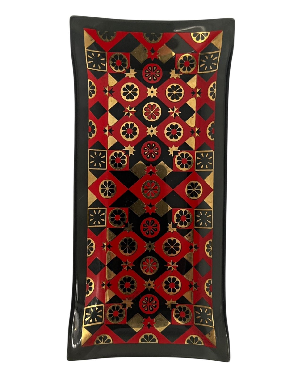 Prato retangular de vidro vintage HOUZE GLASS CORP 6” x 3” com padrão de diamante vermelho e preto EUA.