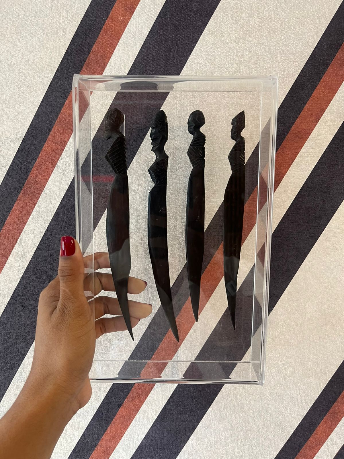 Escultura decorativa composta por quatro figuras humanas estilizadas em tom ébano, apresentadas em uma elegante caixa de acrílico transparente que realça o contraste entre a solidez das formas e a leveza do material. As silhuetas alongadas e minimalistas criam uma composição contemporânea, marcada por equilíbrio, ritmo e expressão artística.