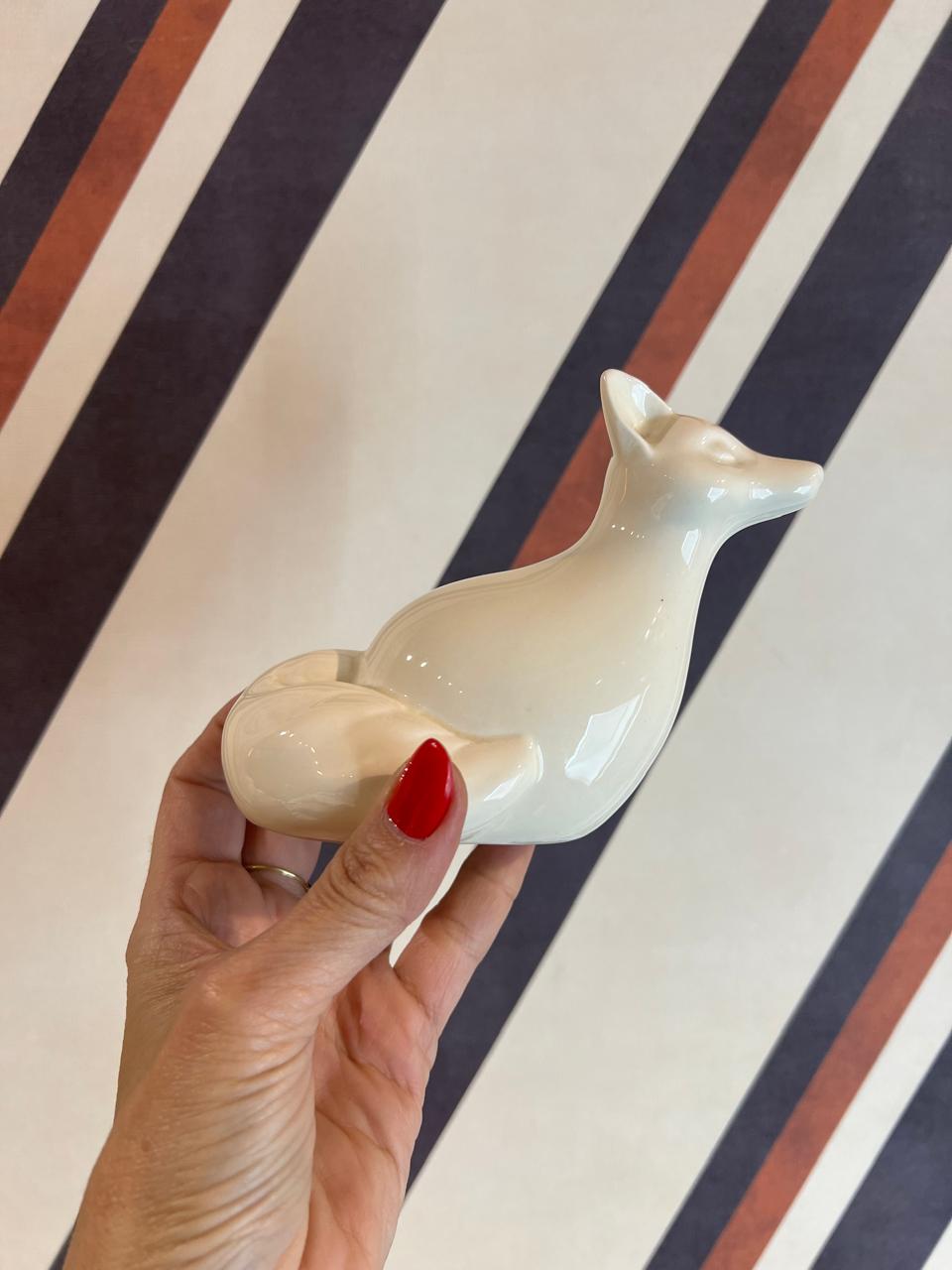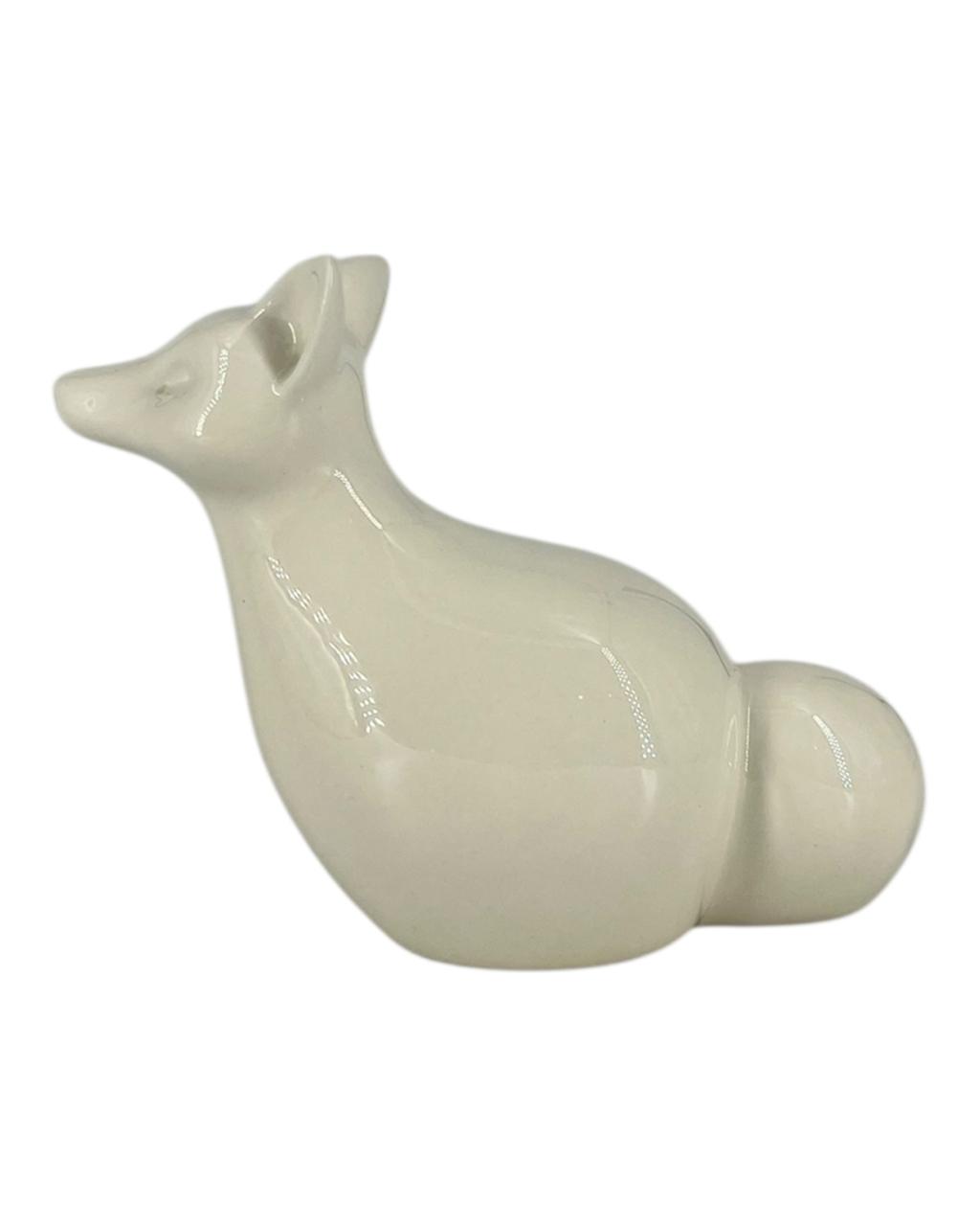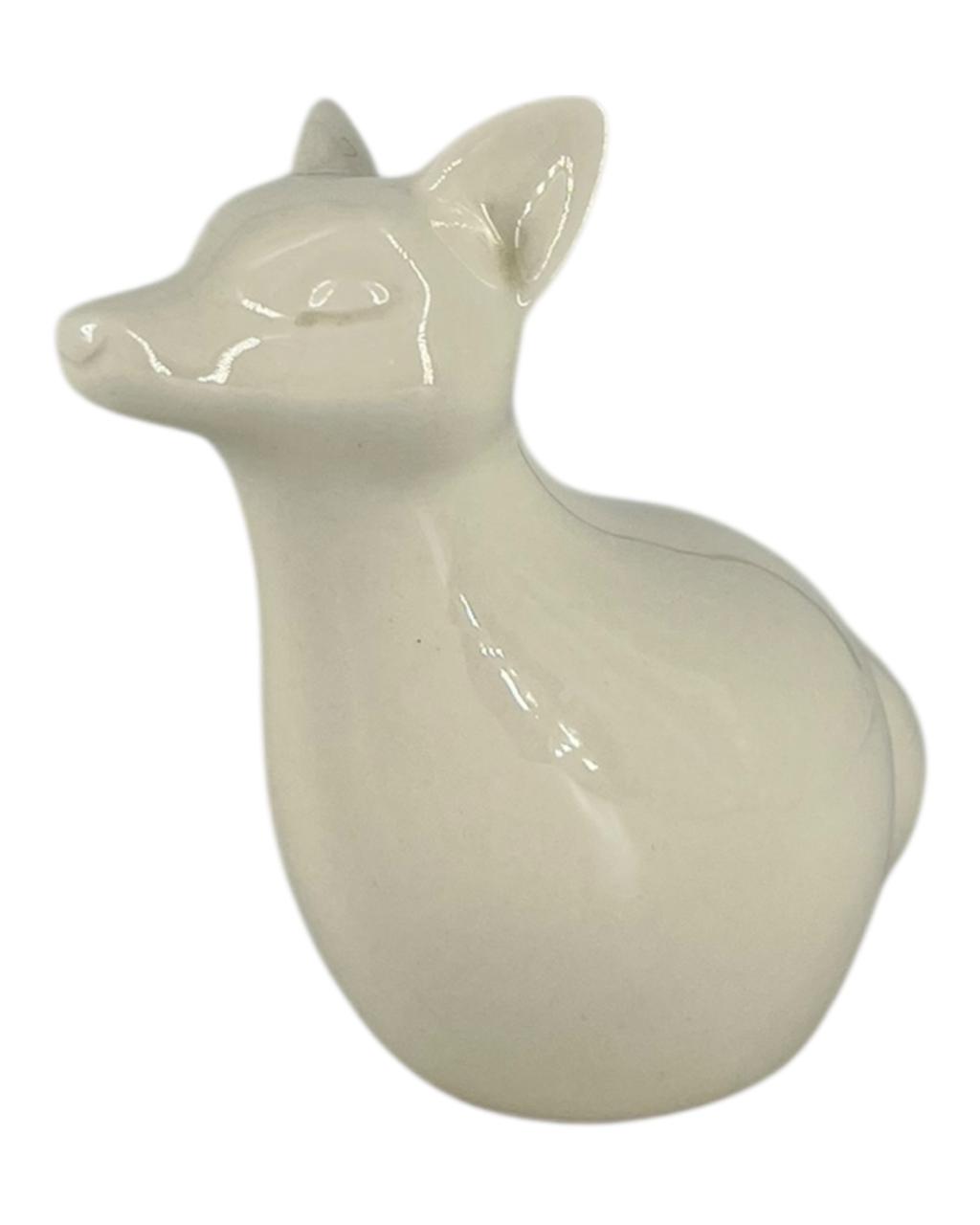 Estatueta de raposa em faiança branca, com um design minimalista e moderno. Possui um estilo clean e elegante, além do branco da faiança destacando as linhas suaves do animal. É um item decorativo, adequado para adornar ambientes como salas, escritórios ou prateleiras, adicionando um toque de natureza e sofisticação.