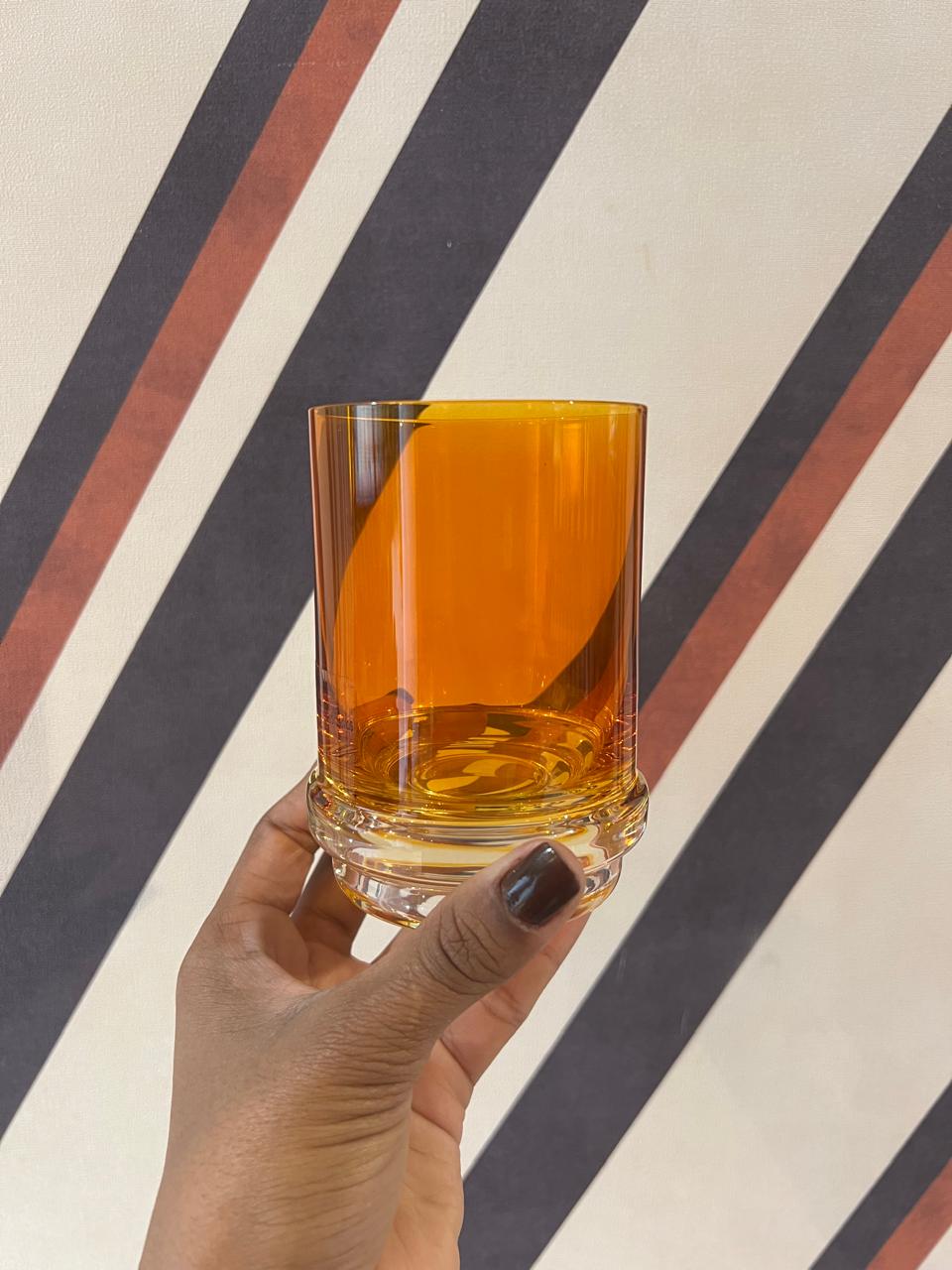 Apresentamos um copo que é puro charme com um toque retrô e moderno. Sua tonalidade âmbar vibrante e sua base esculpida o tornam uma peça de destaque em qualquer bar ou mesa de jantar.