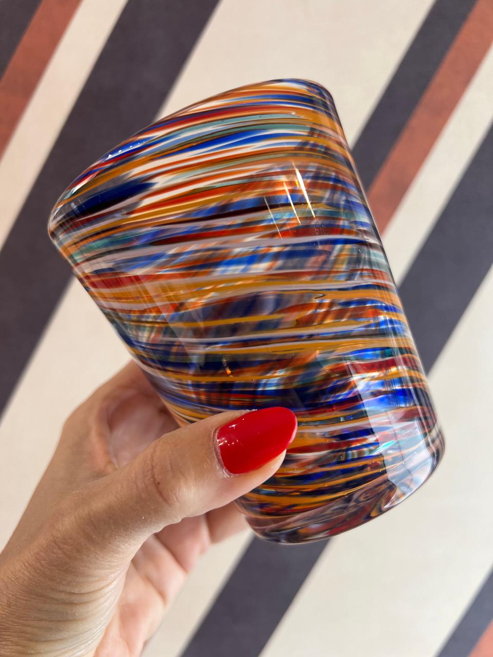 Traga um toque de elegância e originalidade para sua casa com este copo de vidro feito à mão. Cada peça apresenta um design exclusivo com um hipnotizante padrão em espiral, combinando as cores azul sereno, amarelo vibrante, branco puro e laranja energizante. Esta fusão de tons frios e quentes cria uma estética moderna e sofisticada, tornando-o perfeito para qualquer ocasião. O acabamento artesanal garante que cada copo seja único, refletindo a beleza da técnica de sopro de vidro.