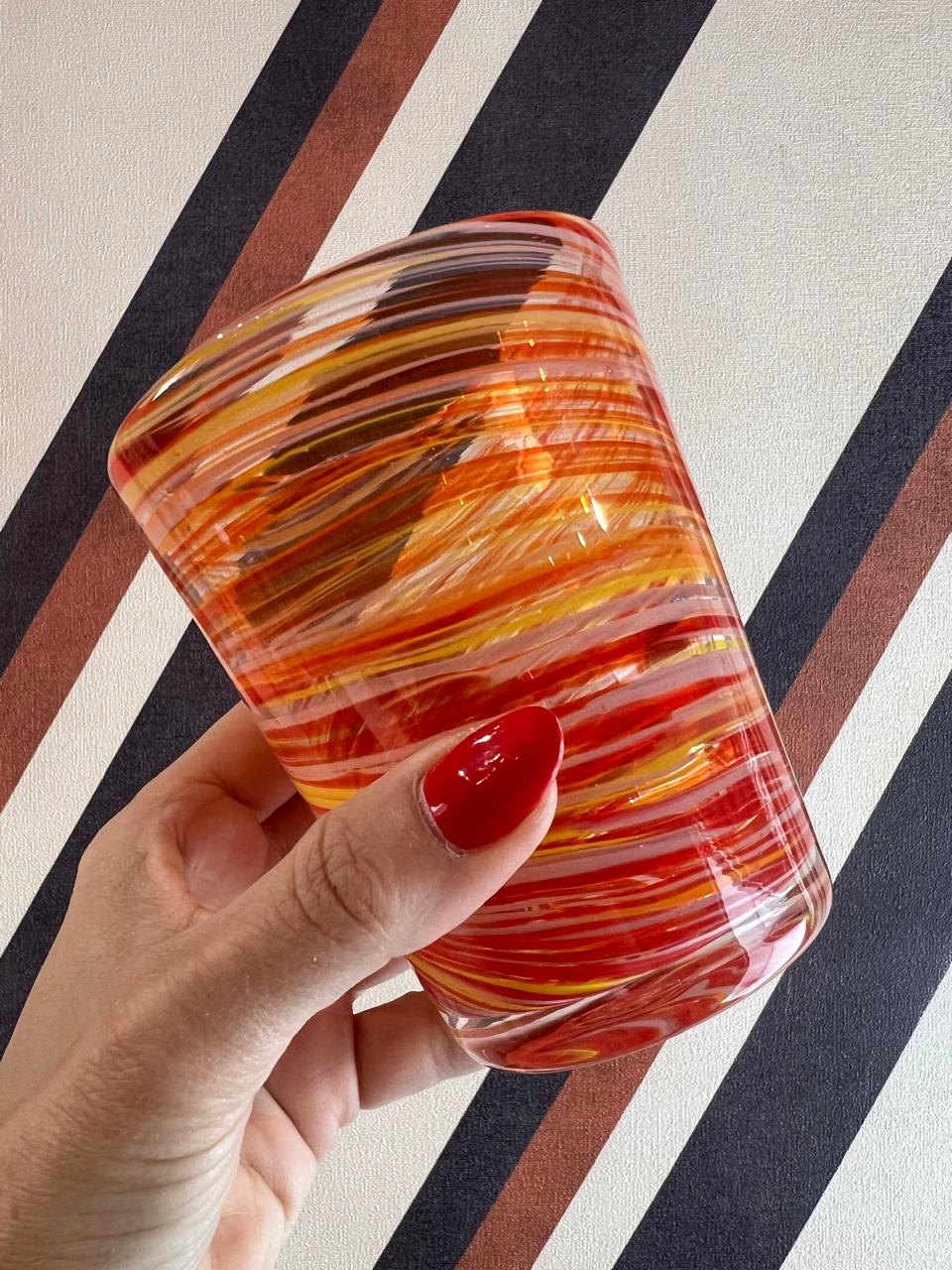 Adicione um toque vibrante e artístico à sua mesa com este copo de vidro soprado artesanalmente. Seu design exclusivo apresenta um padrão em espiral de cores quentes e vivas, como vermelho, laranja e amarelo, que se entrelaçam elegantemente, tornando cada peça única. Padrão espiral e multicolorido, ideal para quem busca originalidade na decoração ou no uso diário.