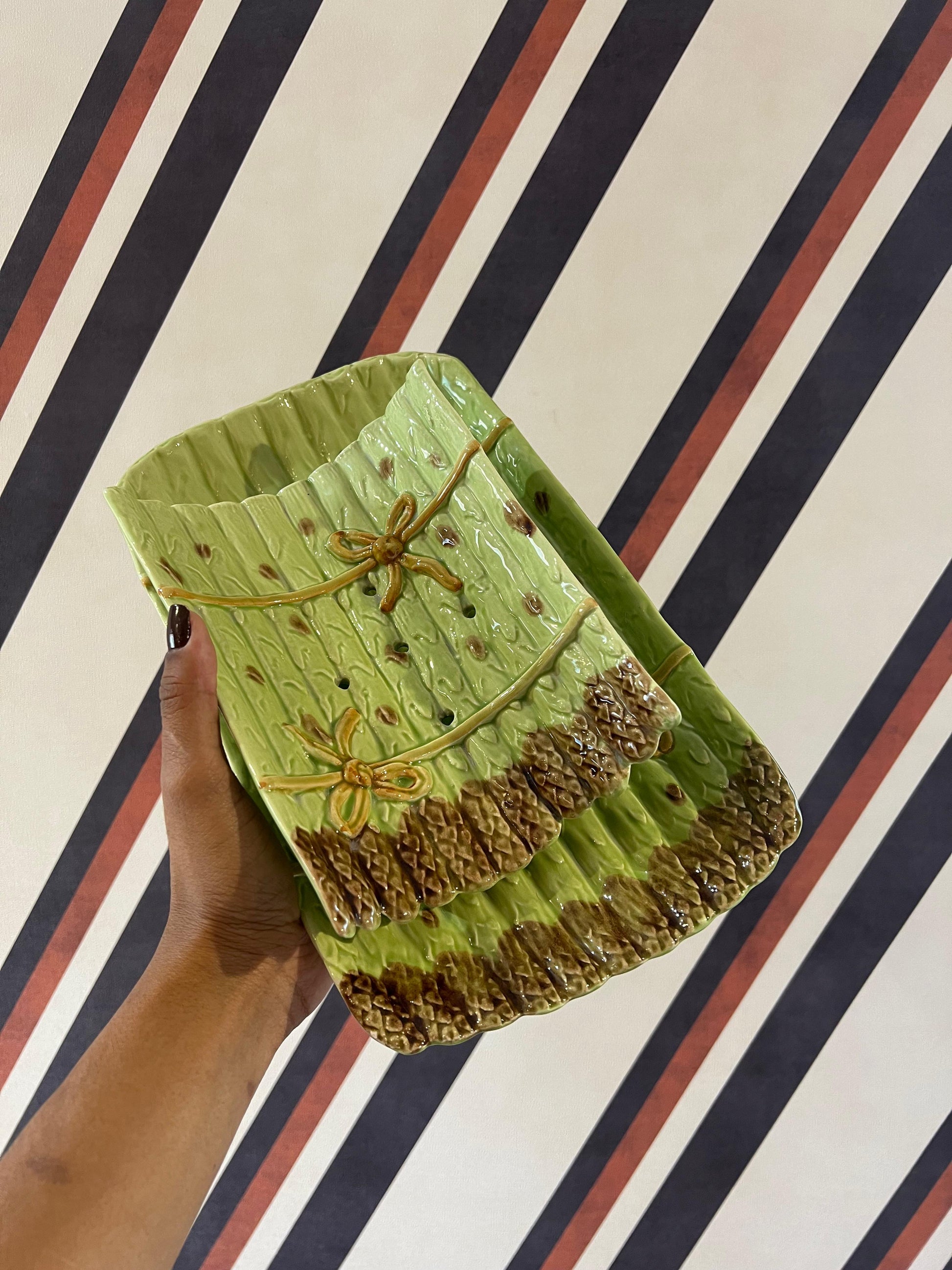 O conjunto é composto por duas peças: uma base com formato de folha canelada e uma travessa superior perfurada que se encaixa na base, permitindo que o excesso de líquido dos aspargos escorra. Ideal para servir aspargos frescos em ocasiões especiais ou como uma peça de destaque na decoração da sua cozinha ou sala de jantar. Apresentando um design realista em forma de molho de aspargos verdes, amarrados com laços decorativos em relevo, em tons vibrantes de verde e marrom.