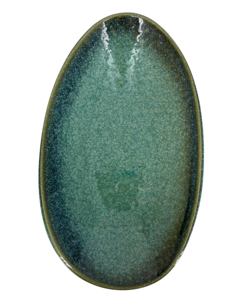 Esta travessa oval combina o charme rústico da cerâmica com um design orgânico e moderno. O acabamento em esmaltado reativo nas tonalidades de verde e azul oceano confere um brilho único a cada peça, garantindo que a sua travessa seja verdadeiramente exclusiva.