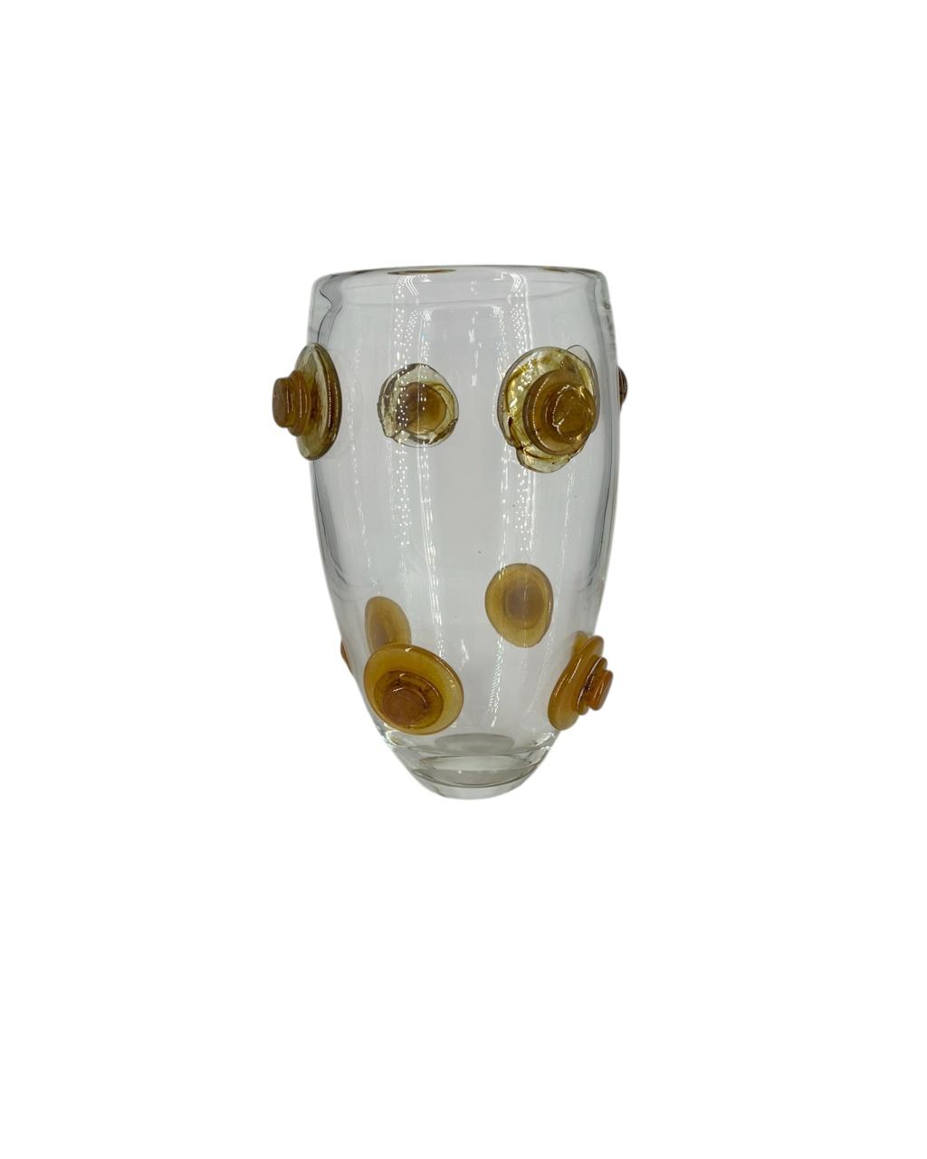Adicione um toque de elegância e sofisticação à sua decoração com esta deslumbrante peça em vidro artesanal. Inspirado na renomada técnica de Murano, este item exclusivo apresenta um corpo em vidro transparente de alta qualidade, adornado com aplicações circulares em relevo na charmosa tonalidade âmbar.